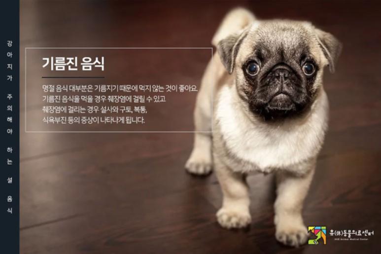 명절 음식은 보통 기름진 음식이 많어요..기름진 음식을 강아지가 먹으면 췌장염에걸리기 어렵지않아요.명절 연휴에 강아지가 동물병원을 찾는흔한 이유 중 하나가 바로 기름진 음식을 먹고내원하게 되는데요..췌장염에 걸리면 설사와 구토, 복통, 식욕부진의증상이 나타나게 되요.췌장염이 반복적으로 나타날 경우 특발성 췌장염이나만성 췌장염으로 이어질 수 있다!!!!:).